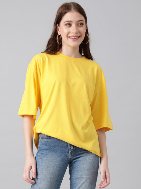 Women Solid Round Neck Cotton Blend Yellow T-Shirt
