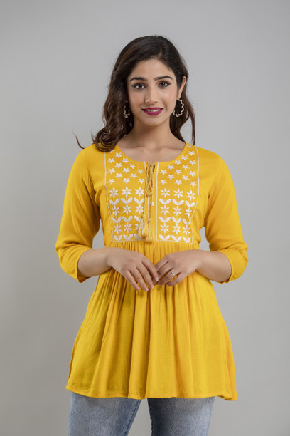 Casual Regular Sleeves Embroidered Women Yellow Top