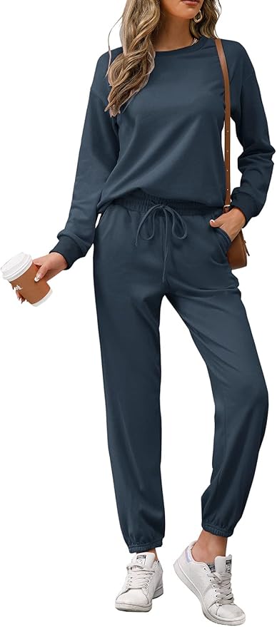 Womens Tracksuit Sets Drawstring Long Sleeve Pullover Top and Elastic Waist Wide Leg Pants with Pockets