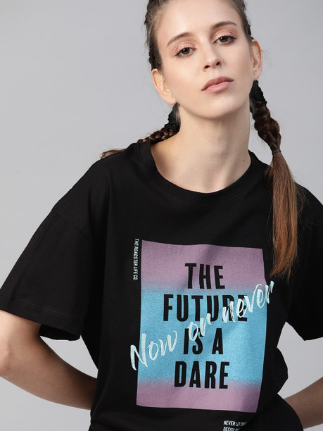 Women Printed Round Neck Pure Cotton Black T-Shirt