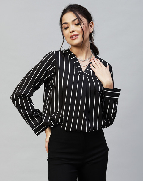Casual Cuffed Sleeves Striped Women Black, White Top