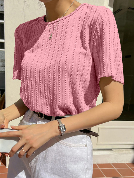 Women Self Design Round Neck Cotton Blend Pink T-Shirt