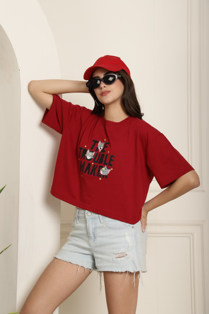 Women Graphic Print Round Neck Cotton Blend Maroon T-Sh...