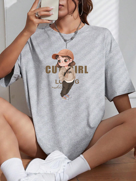 Women Printed Round Neck Cotton Blend Grey T-Shirt