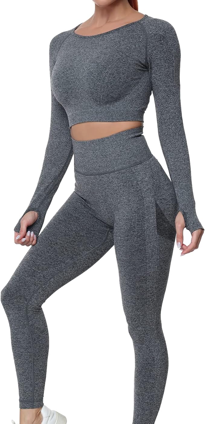 Long Sleeve Workout Crop Top Tank Ribbed High Waist Seamless Leggings