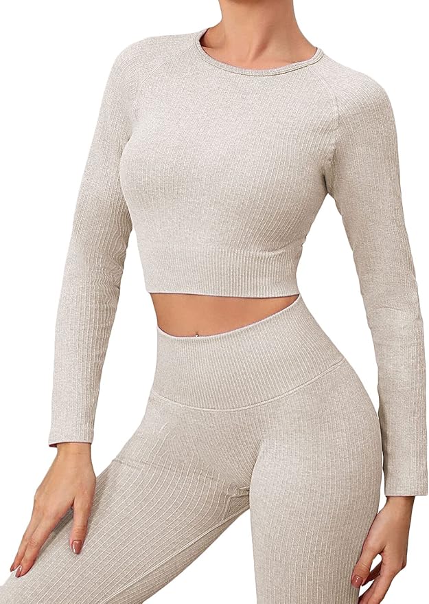 Long Sleeve Workout Crop Top Tank Ribbed High Waist Seamless Leggings