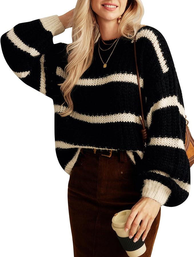 Women Striped Knit Sweater Crew Neck Long Sleeve Jumper Loose Fit Knitwear Tops Sweater for Autumn Winter