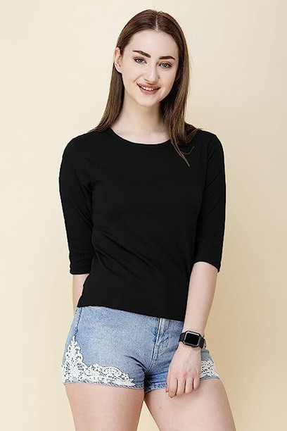 Women Solid Round Neck Pure Cotton Black T-Shirt