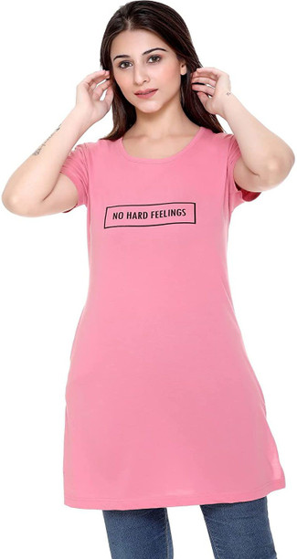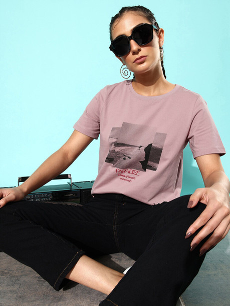 Women Graphic Print Round Neck Cotton Blend Pink T-Shir...