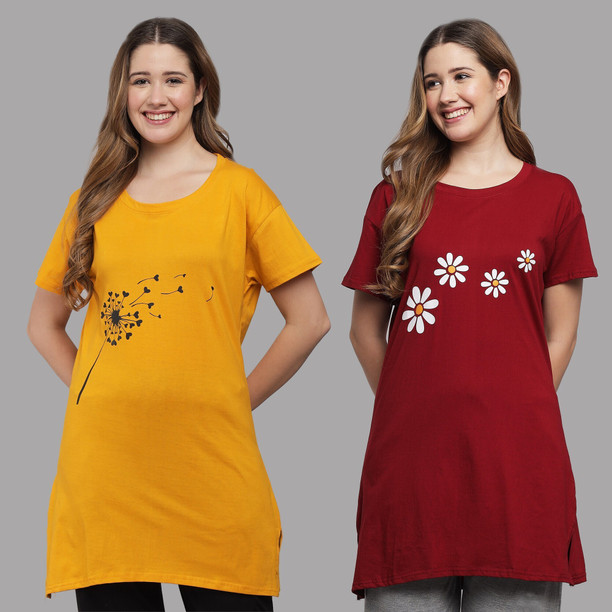 Pack of 2 Women Printed Round Neck Pure Cotton Multicol...