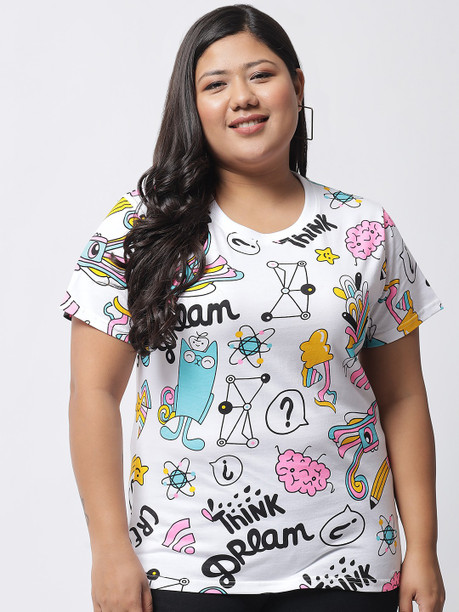 Women Printed Round Neck Pure Cotton White T-Shirt