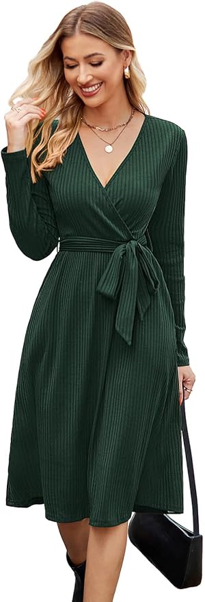 Long Sleeve Dresses for Women : The v neck dress show off your female curve figure, the detachable belt combined with midi knee length, highlights the feminine temperaments and looms your beauty legs